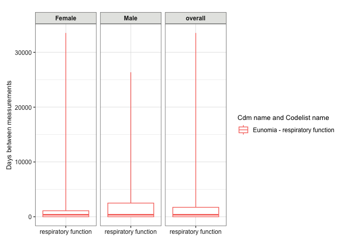 respiratory_function_measurements <- summariseMeasurementUse(cdm, respiratory_function_codes, bySex = TRUE)Among our results is a summary of timings between measurements for individuals in our dataset. We can quickly create a plot of these results like so