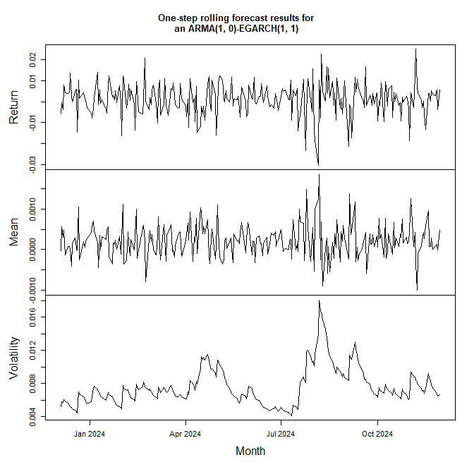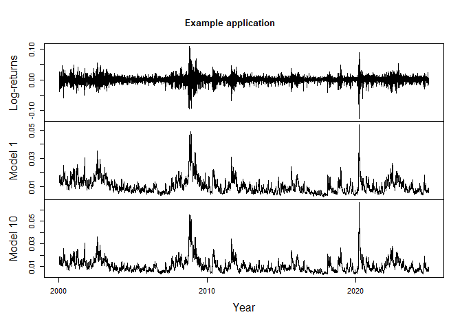spec10 <- megarch_spec(orders = c(2, 1), cond_dist = "std")They can all be used in fEGarch(). In the following, the