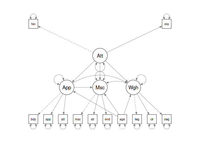 #> large as the direct effect of 'Attractive' on 'Weight'Note that these models involve latent variables. It is also possible to use a combination of latent and observed variables and to use different packages/estimation techniques to fit the models.