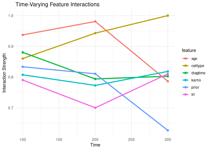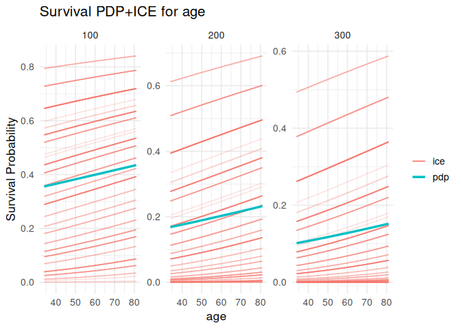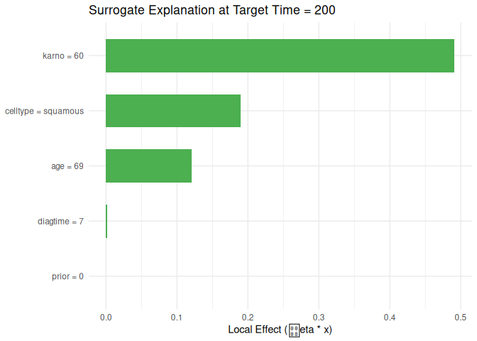 survalis also provides PDP, ALE, surrogate explanations, tree surrogates, permutation importance, interaction analysis, and counterfactuals.