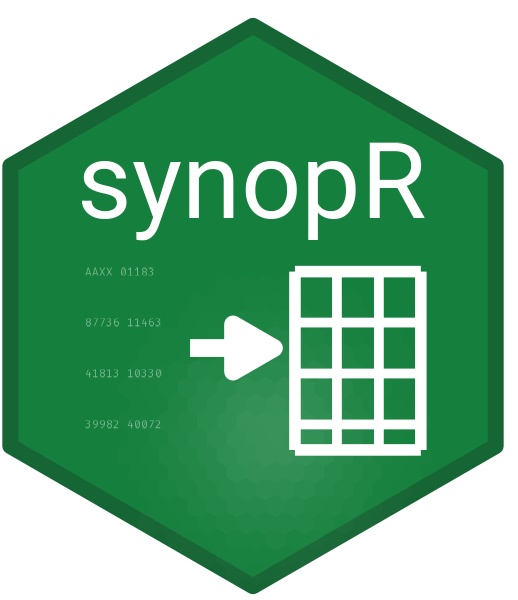 The goal of synopR is to provide a simple and fast tool for decoding FM 12 SYNOP (Report of surface observation from a fixed land station) messages, following the WMO standards (World Meteorological Organization (WMO). Manual on Codes (WMO-No. 306), Volume I.1. Geneva, 2019.). It focuses on extracting data from Sections 0, 1 and 3.